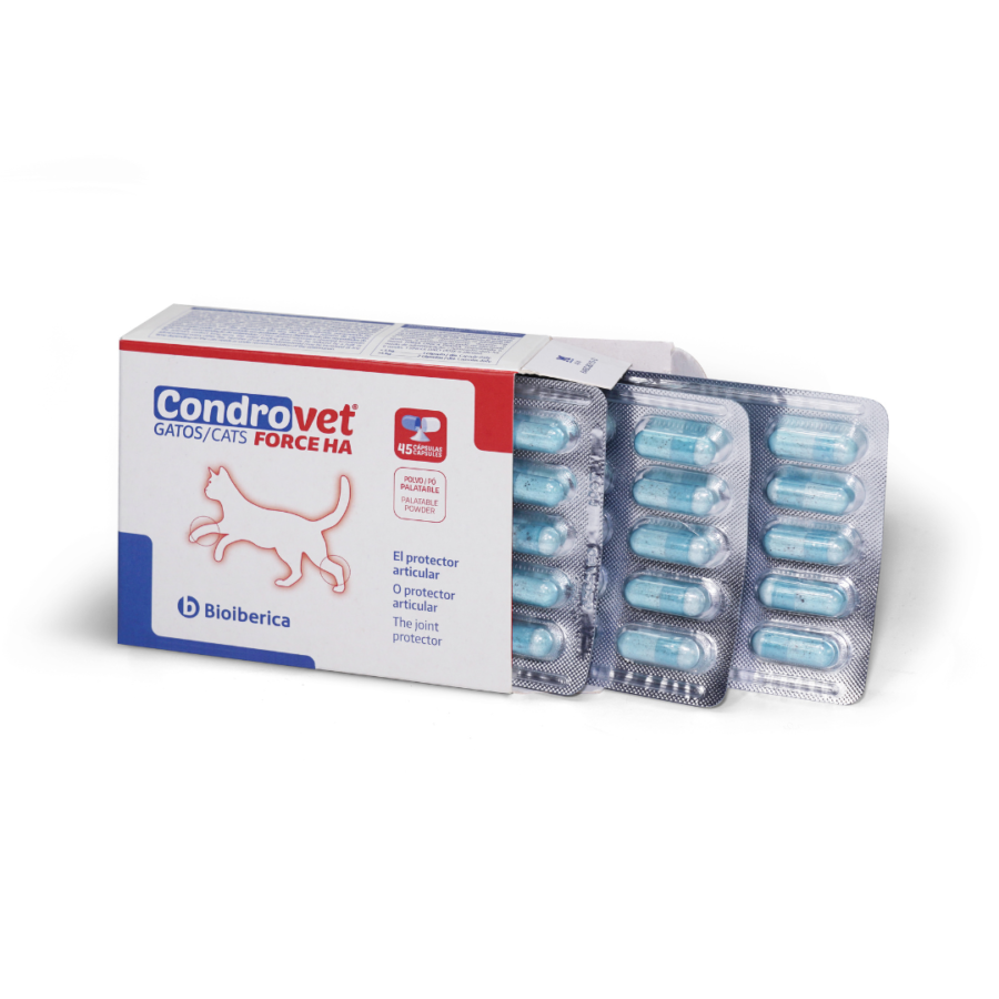Condrovet® Force HA Cats is a complementary food recommended for maintaining cat joints. Chondroitin sulphate and Glucosamine HCl are key components of the joint cartilage matrix and help maintain joint function and mobility. Thanks to its Hyaluronic Acid content, Mobilee® contributes to the correct maintenance of synovial fluid, essential for recovering joint mobility.